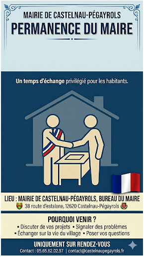 Monsieur le Maire organise des permanences en Mairie les samedis matins. Les prochaines permanences sont prévues les : 18/04/2026 de 10h à 12h et 02/05/2026 de 10h à 12h Pour prendre rendez-vous contacter la mairie Tél. 05.65.62.02.97 ou par mail à contact@castelnaupegayrols.fr